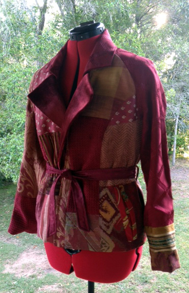 red coat2 A concoction of lovely fabrics in reds, with a velvet lapel, make this jacket feel very luxurious. Size 10